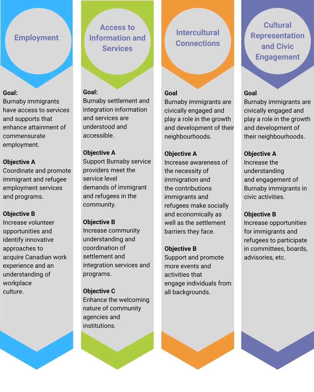 Burnaby’s Settlement and Integration Strategic Plan has identified four strategic priorities.